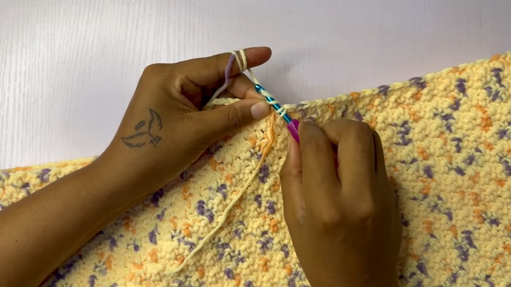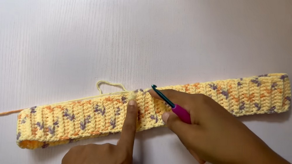 - For the remaining stitches (except the last one), work single crochets into the front loops only.