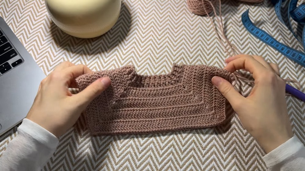 - Repeat this pattern (adding rows) until the yoke depth reaches 9 cm or the desired fit.