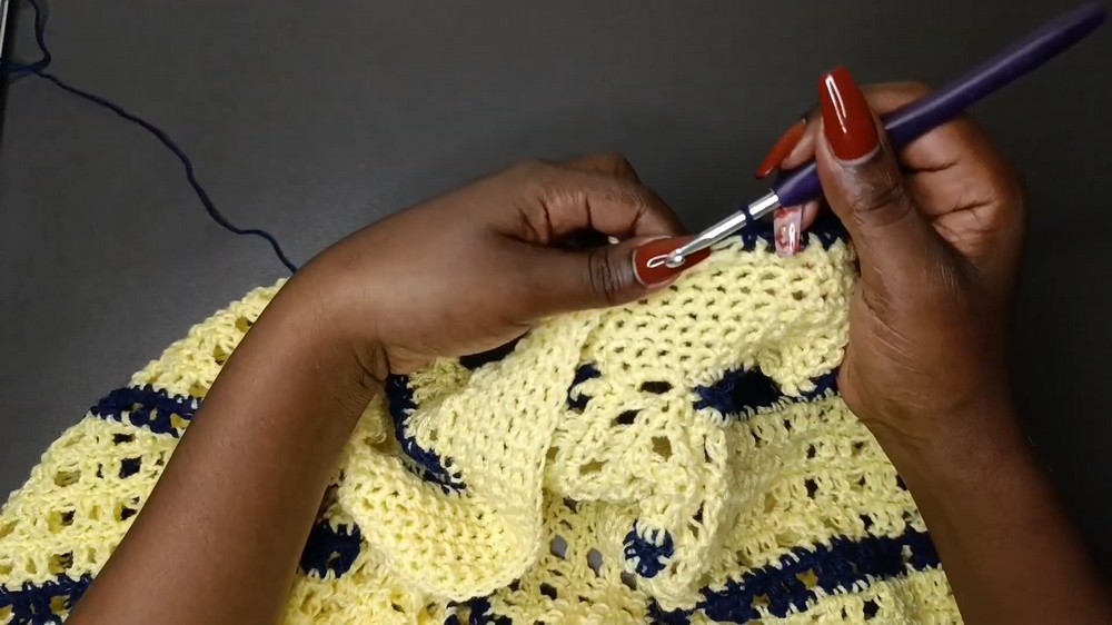 - Work 2 sc in dc rows and 1 sc in sc rows.