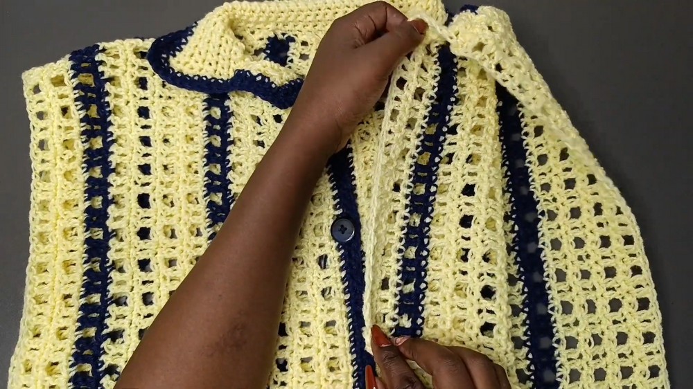 - Work 1 sc into each st along the front edges, neck openings, and back collar.