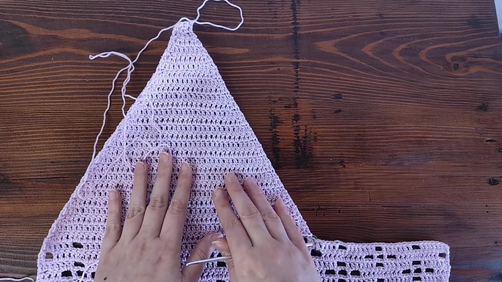 - Join the strap to the top corner stitch of the triangle using Dc. Fasten off.
