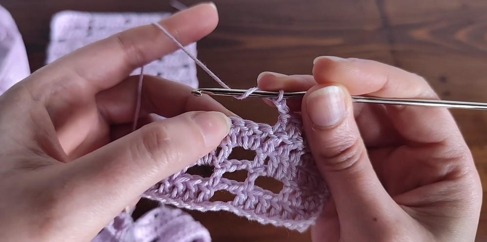 - Chain 2, skip 2 stitches, make 1 Dc in the next stitch.