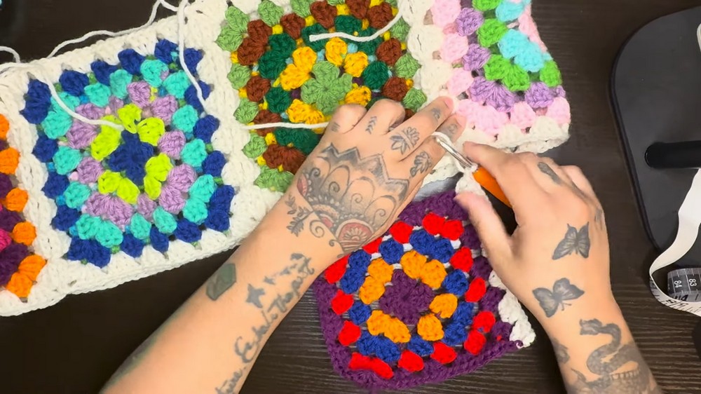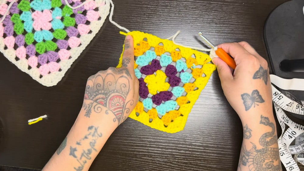 - Create 6 granny squares according to your hip measurement.