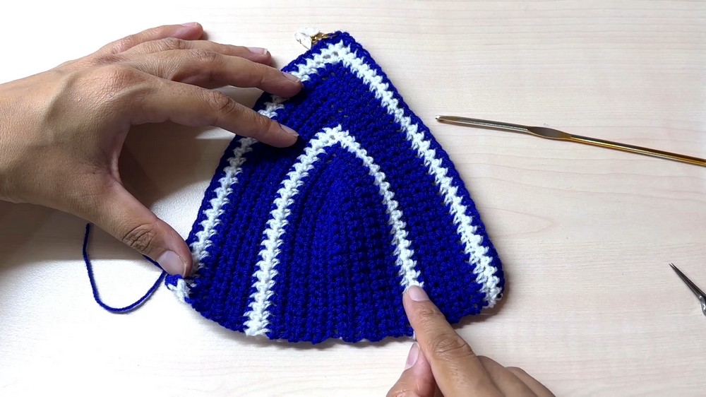- Attach White Yarn to Edges: Work single crochets all around the top edges of the triangle and granny square band.
