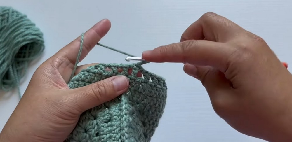 - Sides: 2 dc in the chain spaces, dc across the middle, and 2 dc in the next chain space.