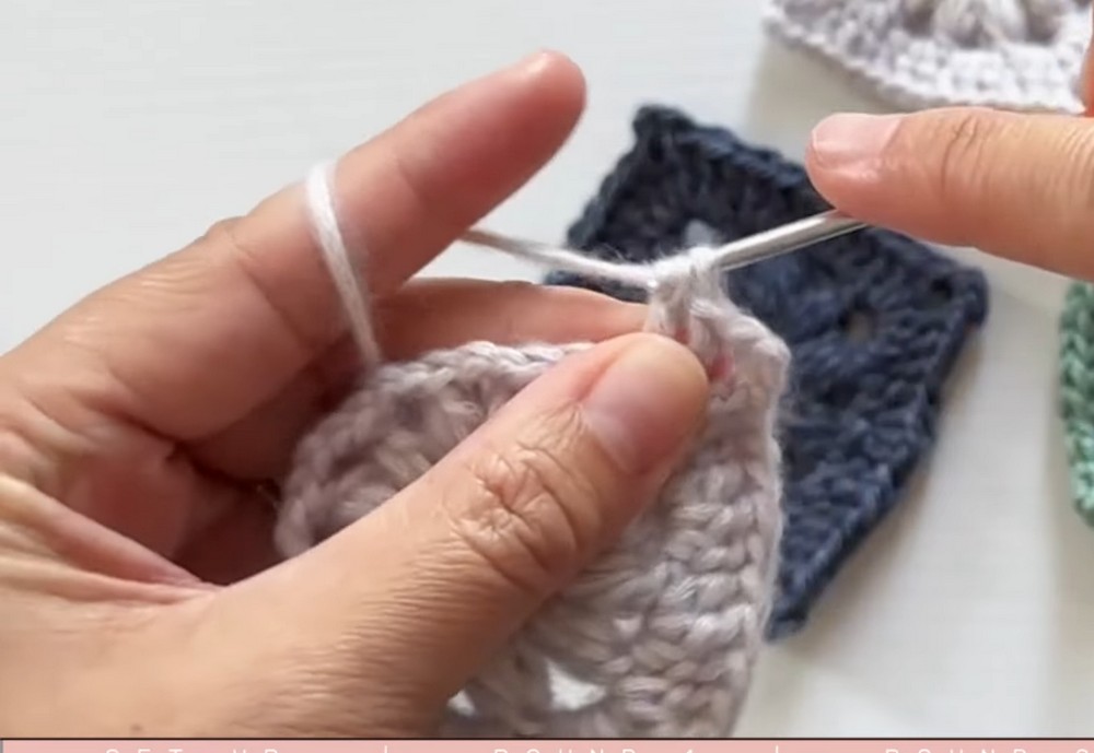 - For each corner: 3 dc, ch 3, 3 dc into the corner chain space (this creates the corner of the square).