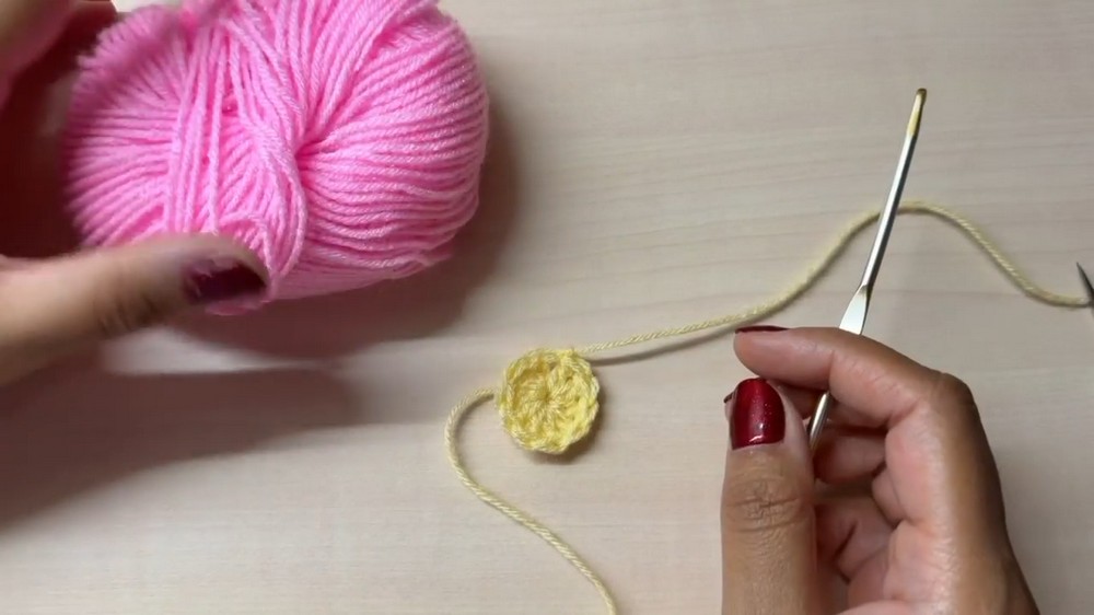 - Start: Use yellow yarn (or your chosen color for the center) to make a magic circle.