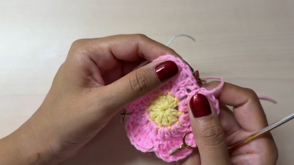 - Insert your hook into the 4th/middle stitch of a petal and attach the yarn with a single crochet (sc).