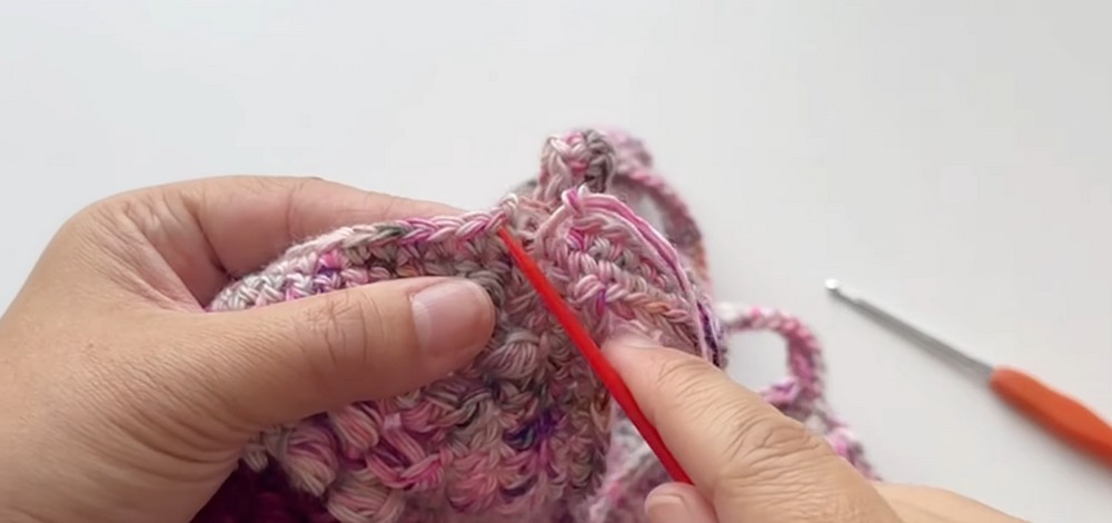 - In the valley between bag sides, work sc2tog to tighten the shape.