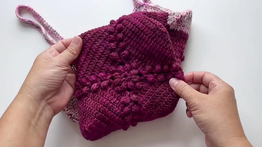 Your granny square bag is complete! Admire the sturdy base, playful bobble accents, and clean lines from the invisible join. Adjust colors, dimensions, or straps for customization.
