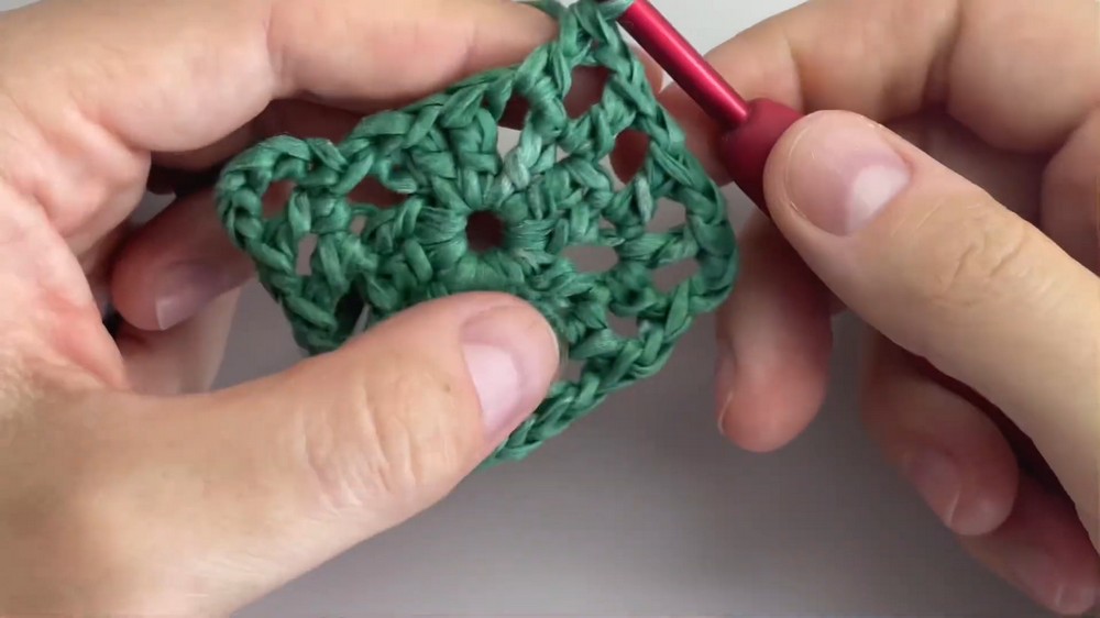 - After the last corner is completed, sl st into the 3rd chain of the starting ch-5.