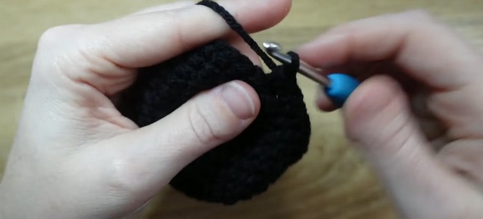 - Insert hook into Round 15 of the black body along the bottom (align with eyes). Pull up a loop of orange. Chain 2.