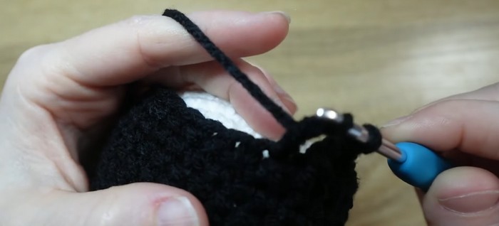 - Insert the white body into the black shell. Line up the BLO loops from Round 11 with the white body, centering the black around its face and eyes.