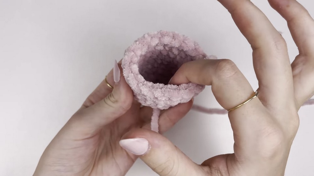 Flip the work inside out so the pretty side is on the inside of the mouth. This ensures the back loops from the previous round remain visible on the exterior for the body later.