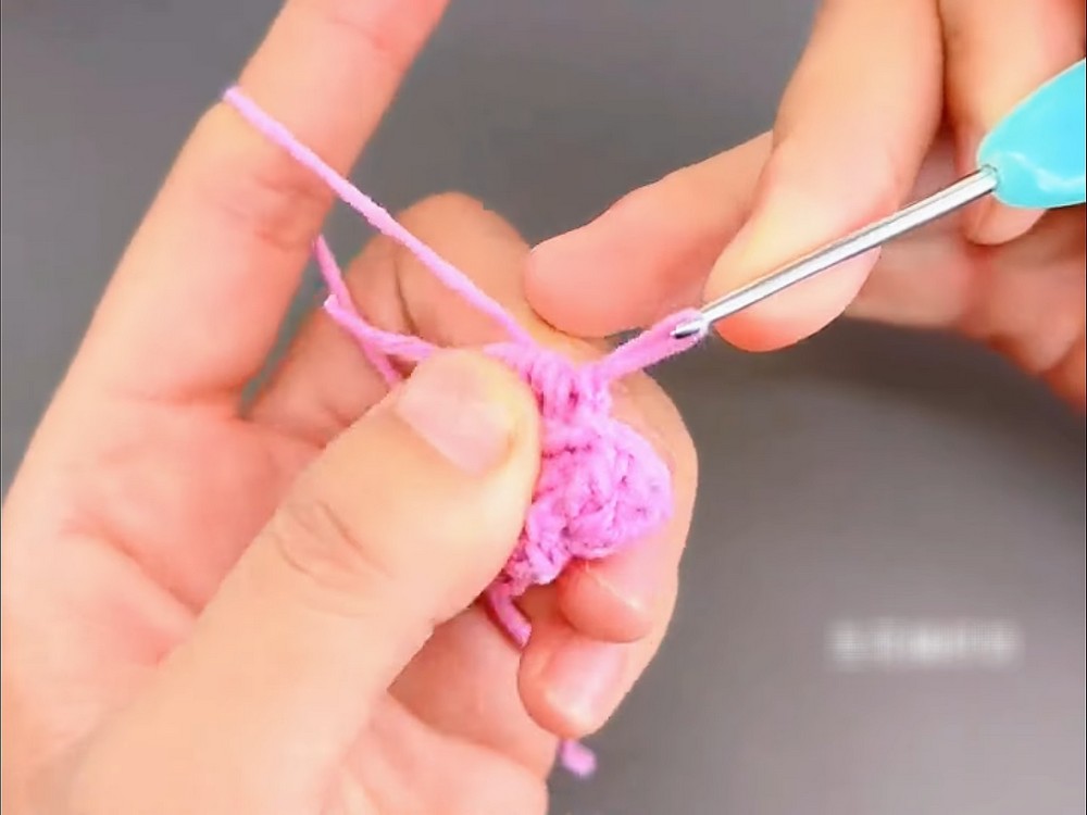 - Yarn over, insert the hook into the ring, pull yarn through, yarn over, pull through two loops, and then pull through the remaining two loops. Repeat this to create 12 double crochet stitches in total.