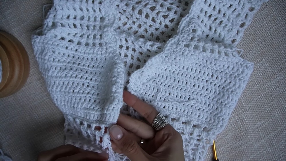 - Work wider mesh rows with ch 2, skip 2, dc into next stitch, creating flowy gaps. Increase every row by adding stitches at the start and end.