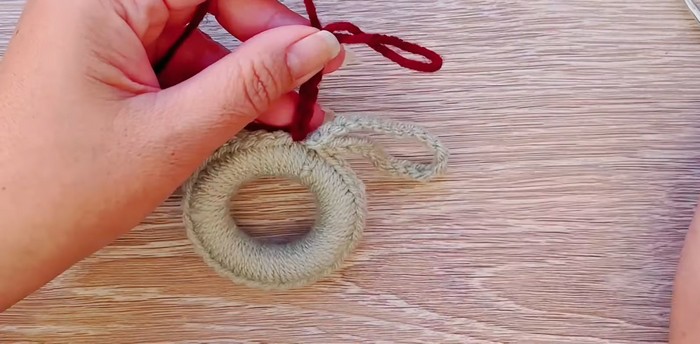 - Create a chain of 25 stitches for the hanging loop, then attach the last stitch to the first chain with a SL ST.