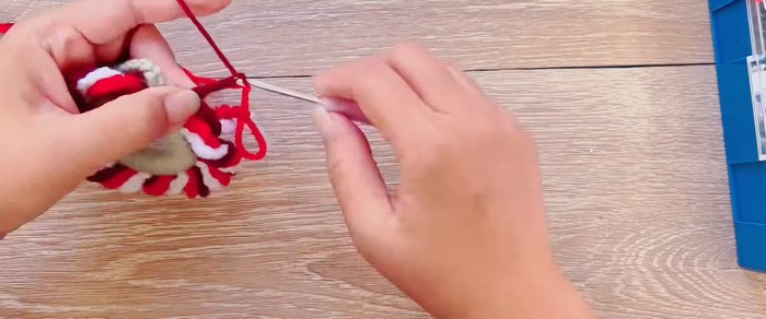 - Continue this method (SC + CH6) around the entire base, alternating colors in the same sequence.