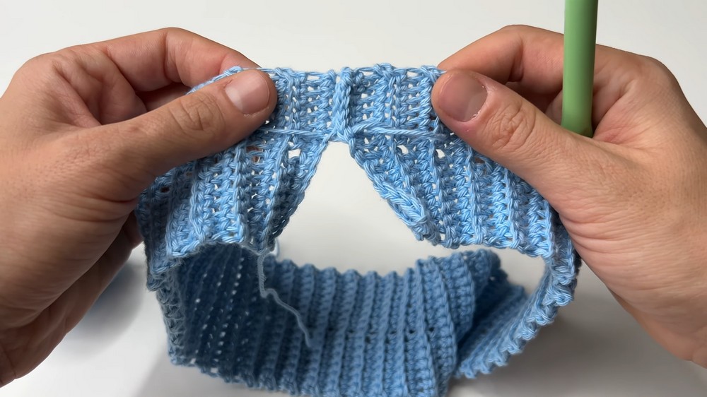 - Add 2 half double crochets (HDC) on top of each row around the waistband.