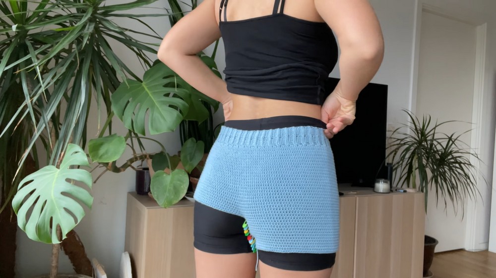 - Pull the loop longer, cut off the yarn, and weave in loose ends on the inside of the shorts.