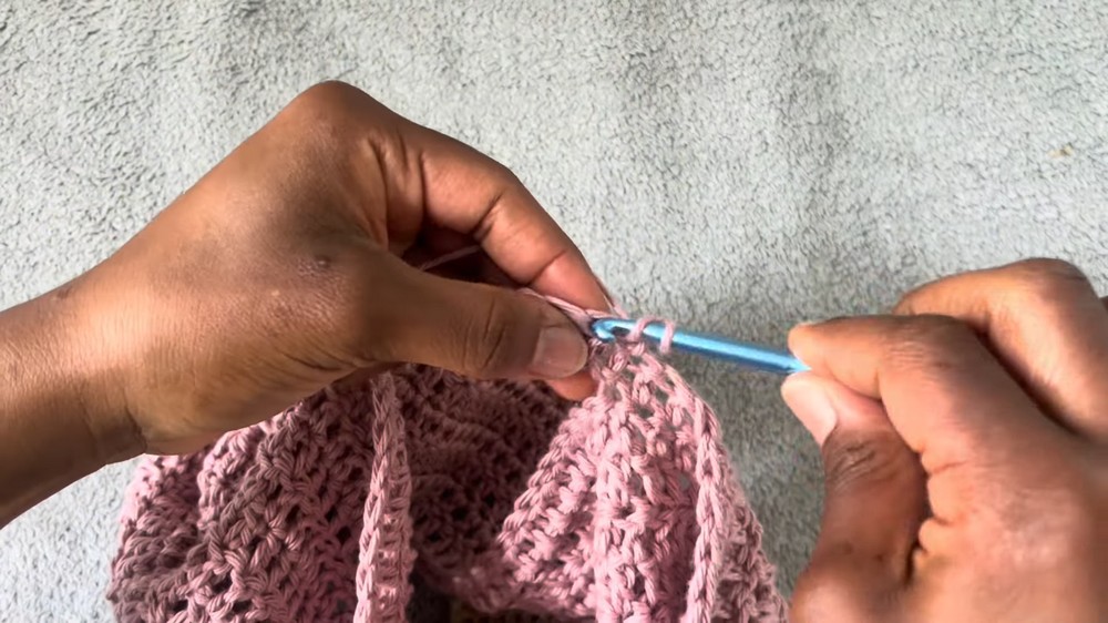 - Weave the chain in and out of the waistband using spaces between stitches as loops.