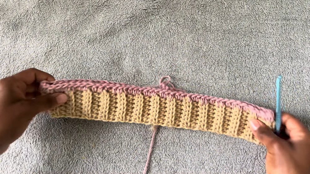- Join your second yarn color (optional) at the middle point and chain 1.