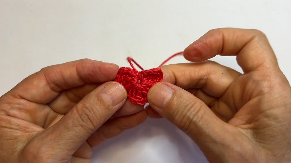 - Tighten and pull both yarn tails tightly to secure the heart shape.