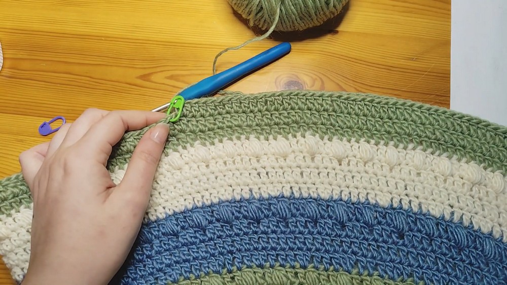 - Color Sequence: The design alternates 4-row color blocks (3 rows dc + 1 puff stitch row).