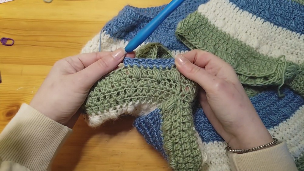 - Crochet around the sleeve stitches (adding a few extra stitches under the arm).